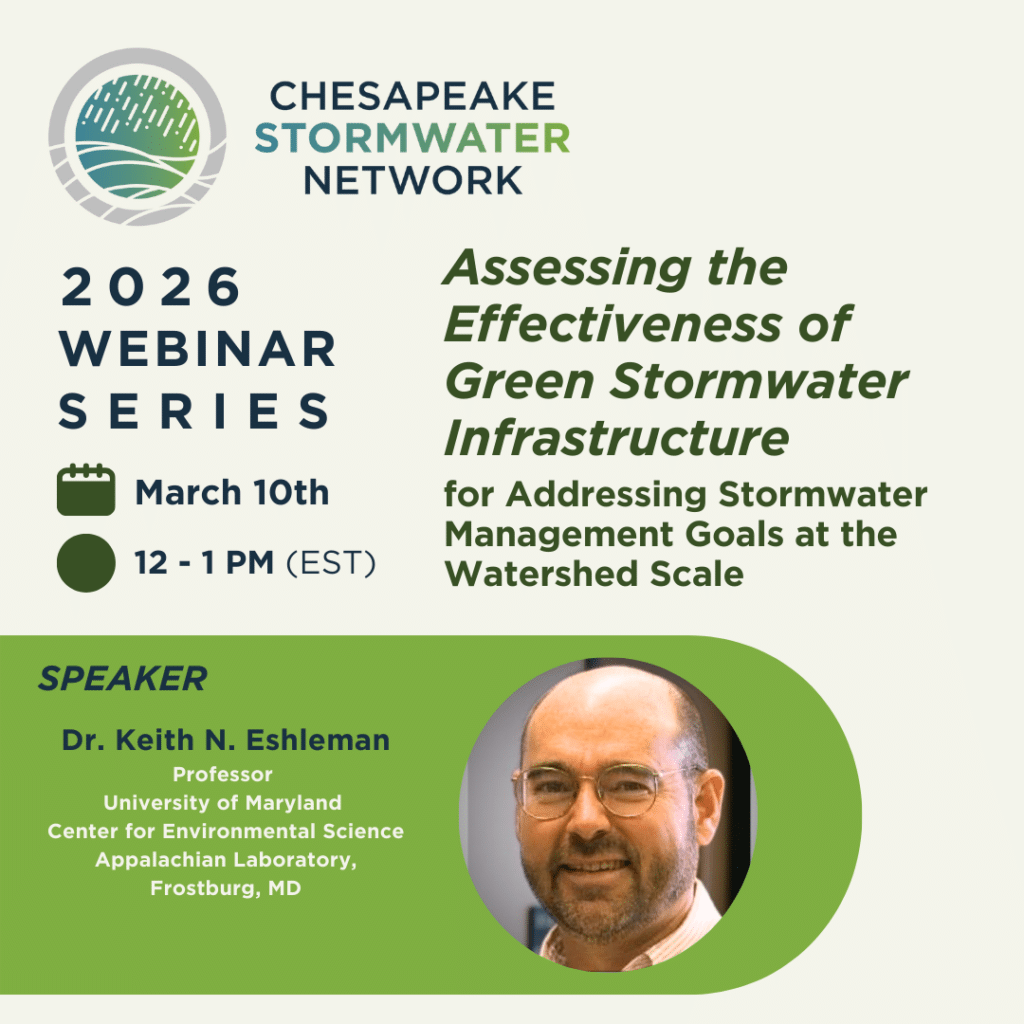 Grab your lunch and join the Chesapeake Stormwater Network on Tuesday, March 10th at noon (EST), for our latest webinar – Assessing the Effectiveness of Green Stormwater Infrastructure for Addressing Stormwater Management Goals at the Watershed Scale
